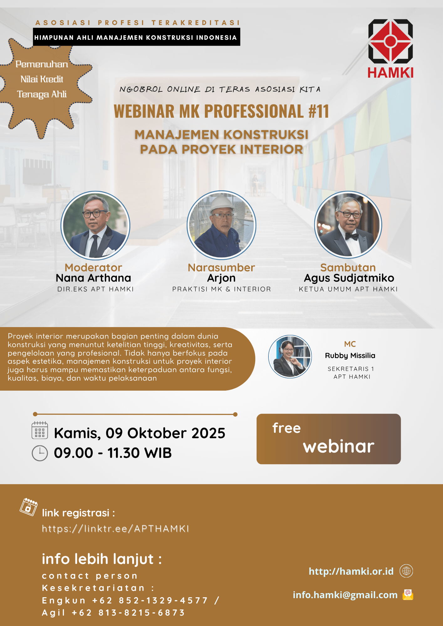 Himpunan Ahli Manajemen Konstruksi Indonesia ( HAMKI ) adalahย Asosiasi profesi nirlaba yang didirikan di Jakarta pada tanggal 23 Agustus 1986 untuk jangka waktu yang tidak terbatas. Dengan tujuan sebagai wadah komunikasi, konsultasi, koordinasi dan pemersatu semua anggota HAMKI pada khususnya dan para Ahli Manajemen Konstruksi Indonesia pada umumnya.